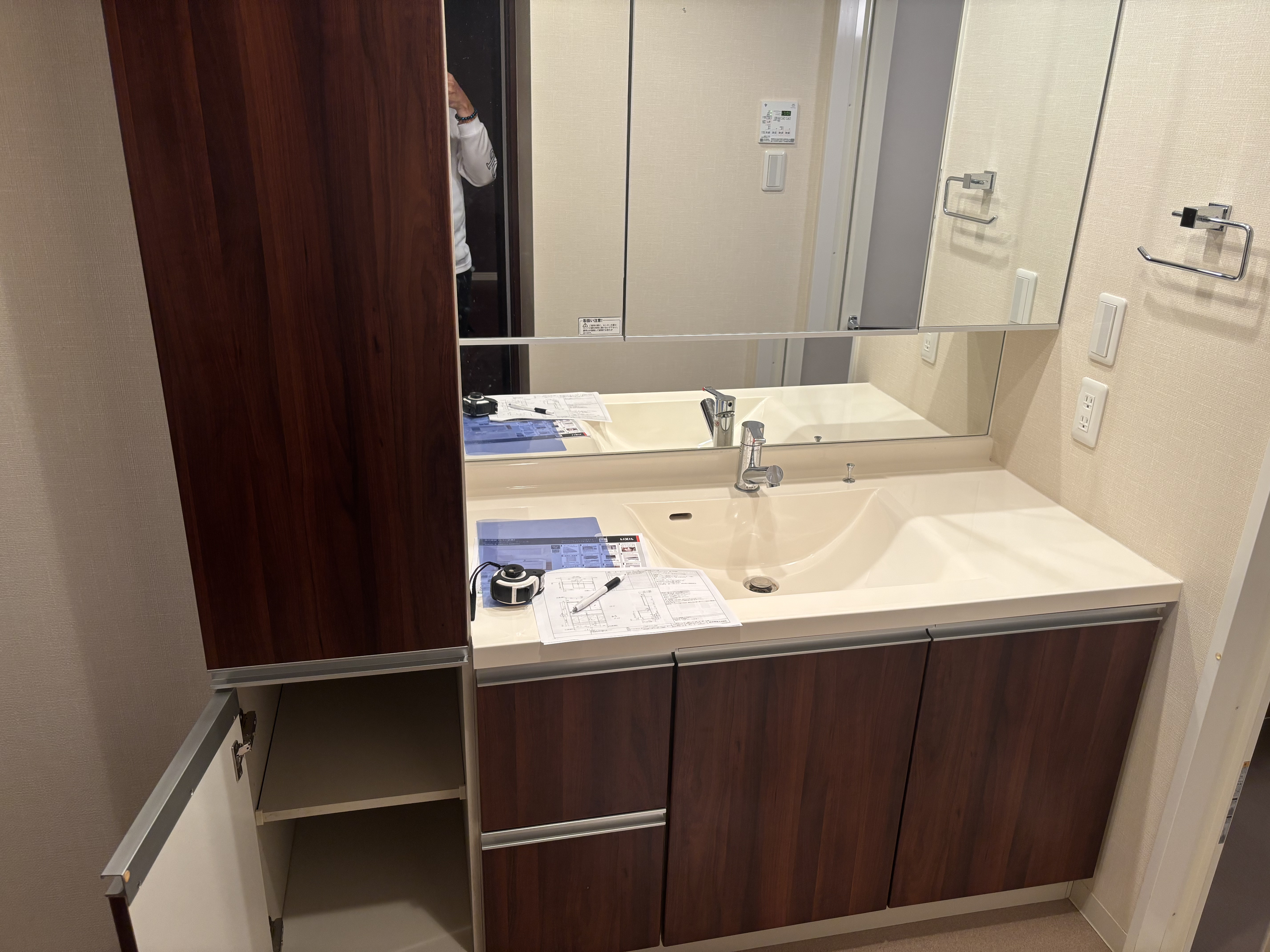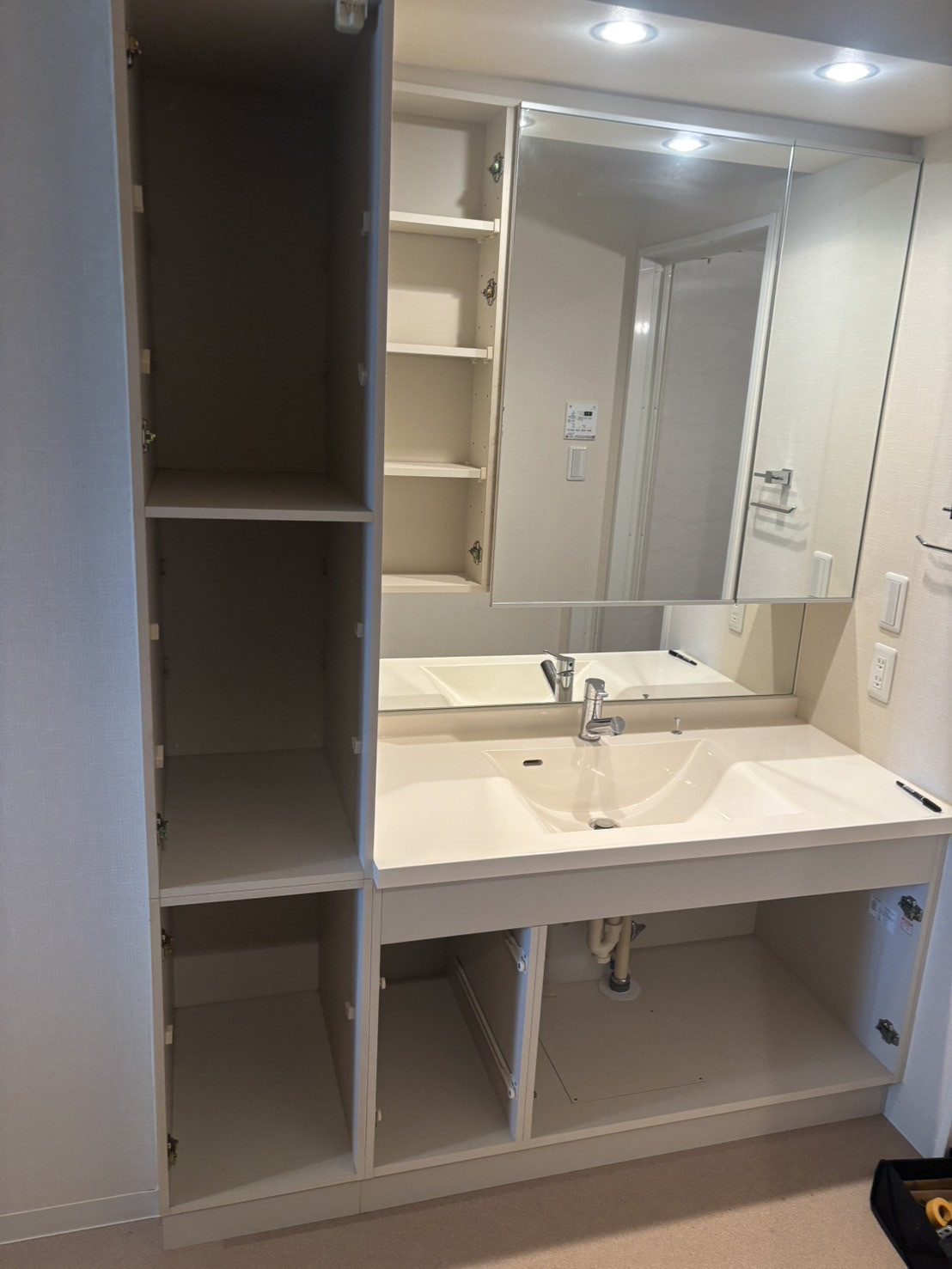 古いシステムバスを解体解体完了リクシル システムバス スパージュ洗面台解体リクシル 洗面台新設キッチン解体解体、設備工事、